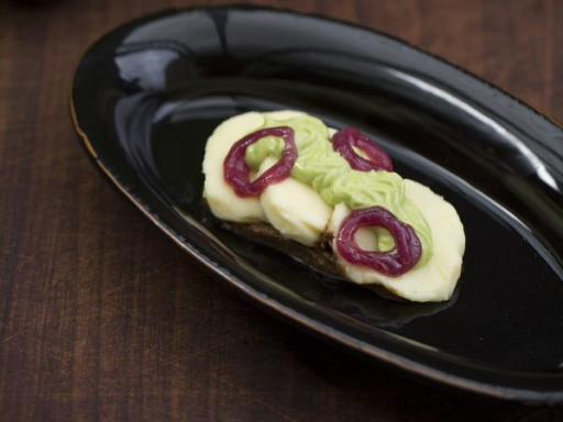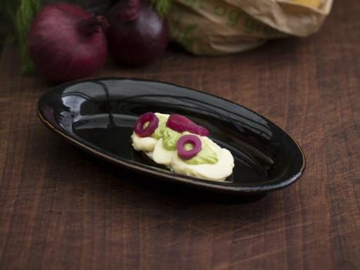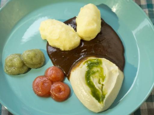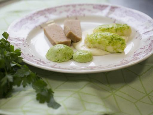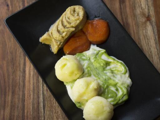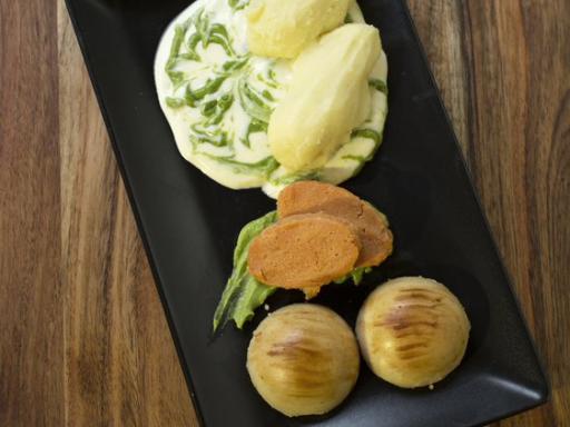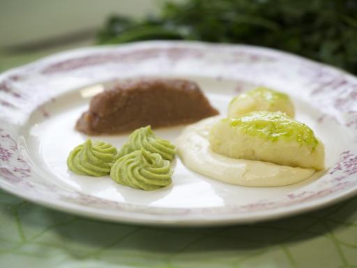 Når der er almindelige kartofler på menuen, kan mosen formes med en varm ske, så det ligner almindelig kartofler. Kom evt. en urteolie ovenpå kartoflerne for at skabe noget farve i retten.